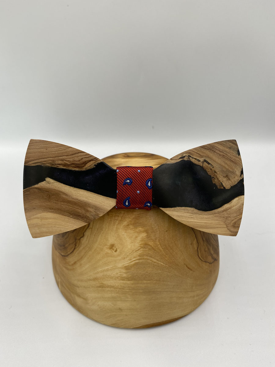 Raisin bow tie from olive wood with the stardust color of raisin, the middle stripe is red and has few leaves of dark blue color.
